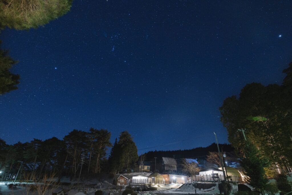 また、冬は空気が澄んでいるため、夜になると星空が一段と美しく見えます。焚き火のぬくもりを感じながら星を眺める時間は、冬の長野グランピングならではの贅沢な体験。写真映えもしやすく、静かな非日常を求める人にぴったりの季節です。